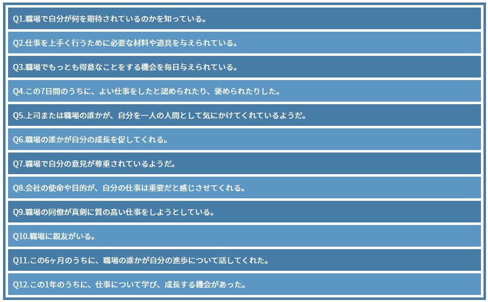 Q12…従業員や組織のエンゲージメントを可視化するための、企業の業績と密接に関連する12の質問。